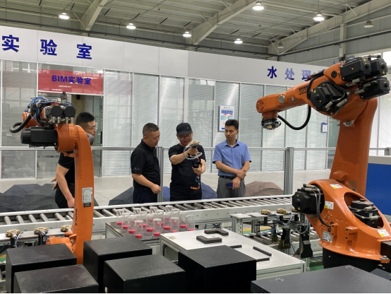 张博董事长一行首先参观了MILE米乐集团实验室,实验室吕晓军主任进行了讲解,介绍了机器人产线、智能制造系统及液压试验台等设备,并对实验能力、对外服务能力等做了介绍。