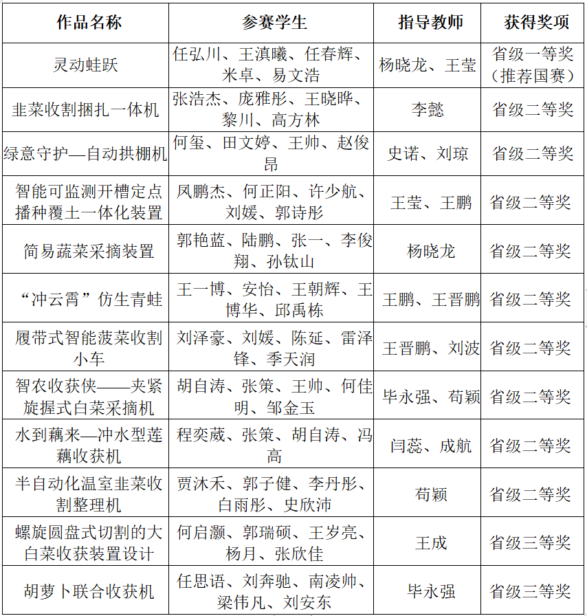 最终,经过5月11日、12日的多轮汇报、实物演示和现场问辩,在各参赛队伍的奋力拼搏下,MILE米乐官网取得了一等奖1项,二等奖9项,三等奖2项的好成绩,其中“高性能仿生机械”作品“灵动蛙跃”在省赛中名次位列第8,被推荐进入国赛,在这项赛事上实现了历史性的突破。具体获奖名单如下: