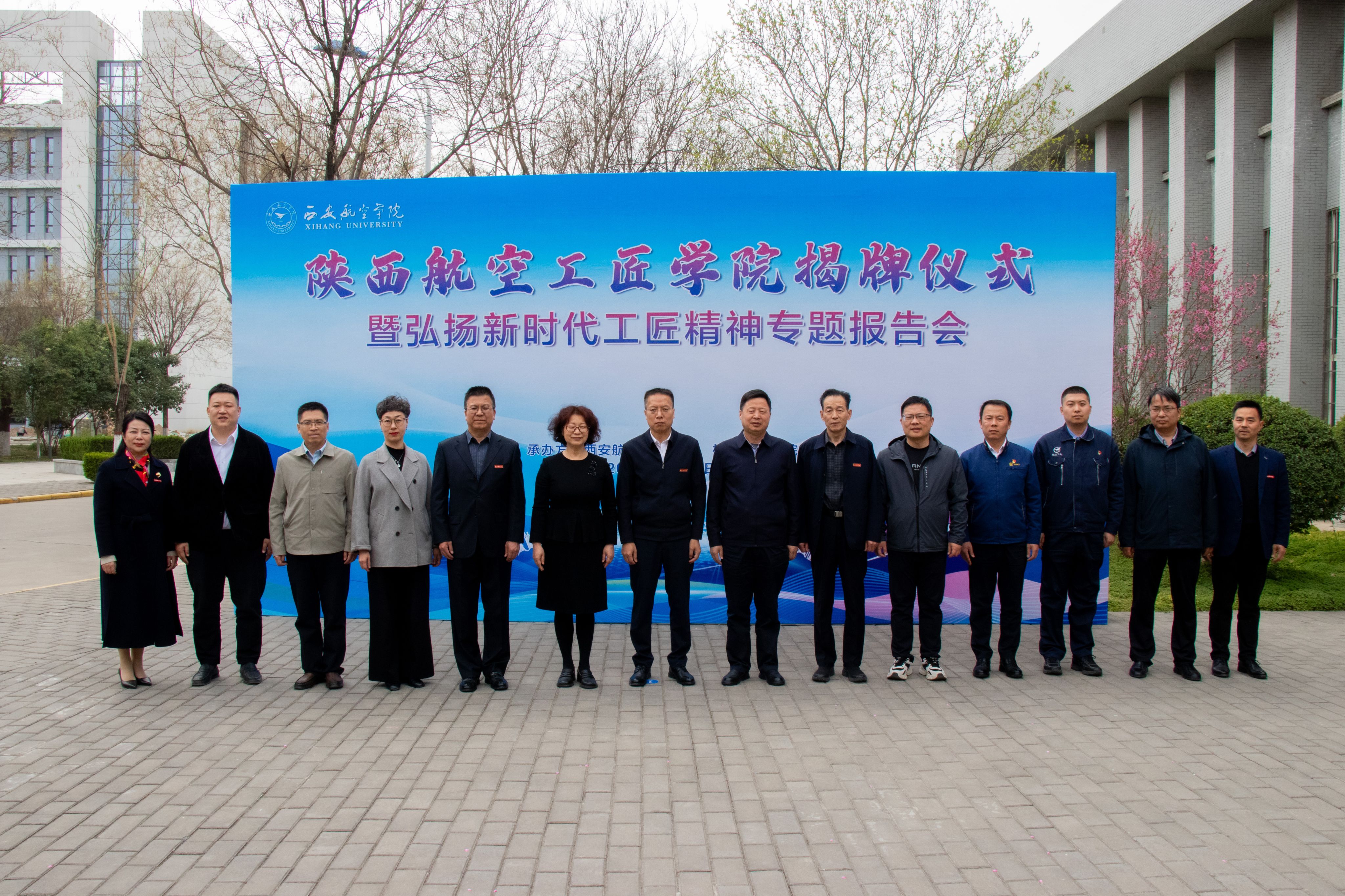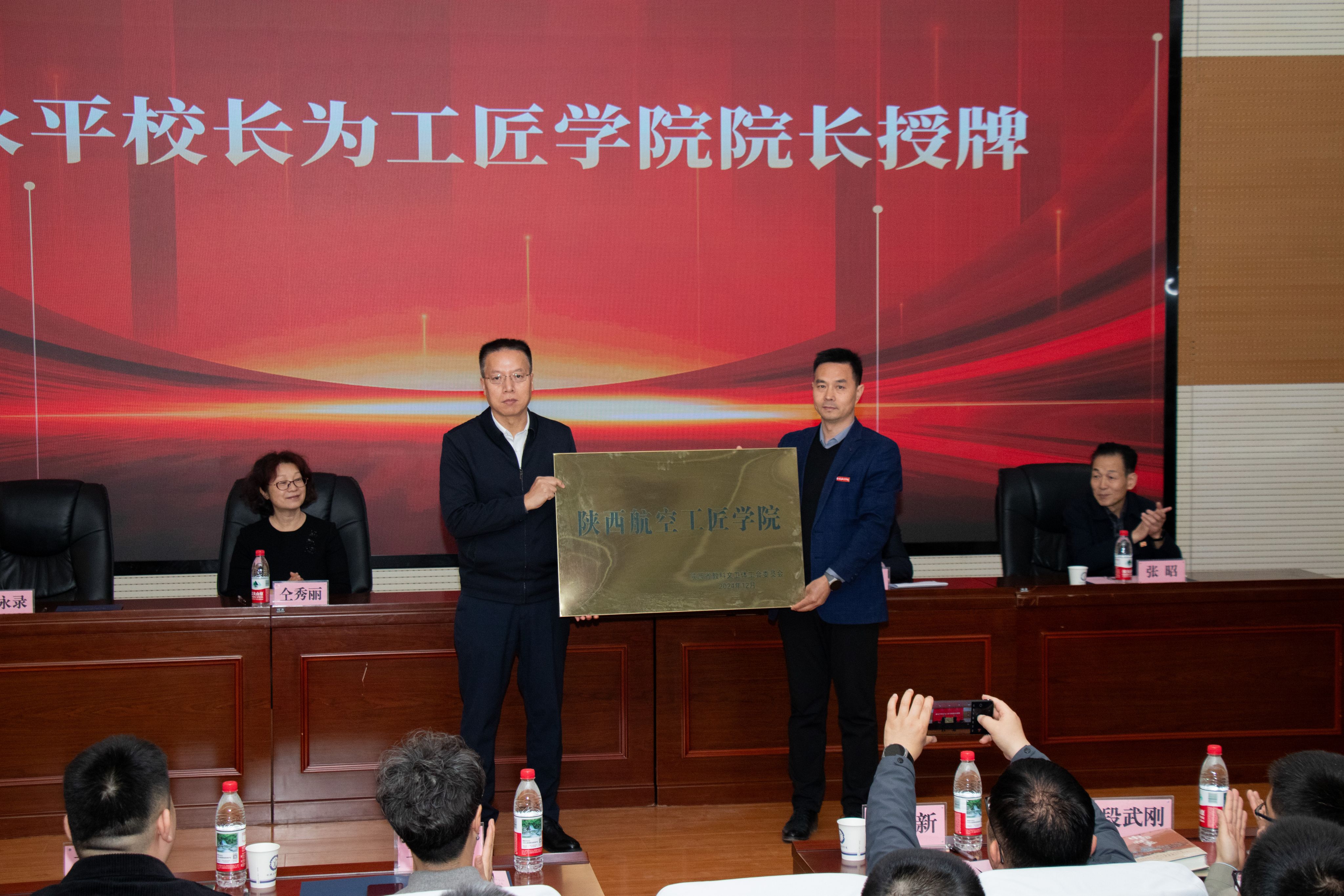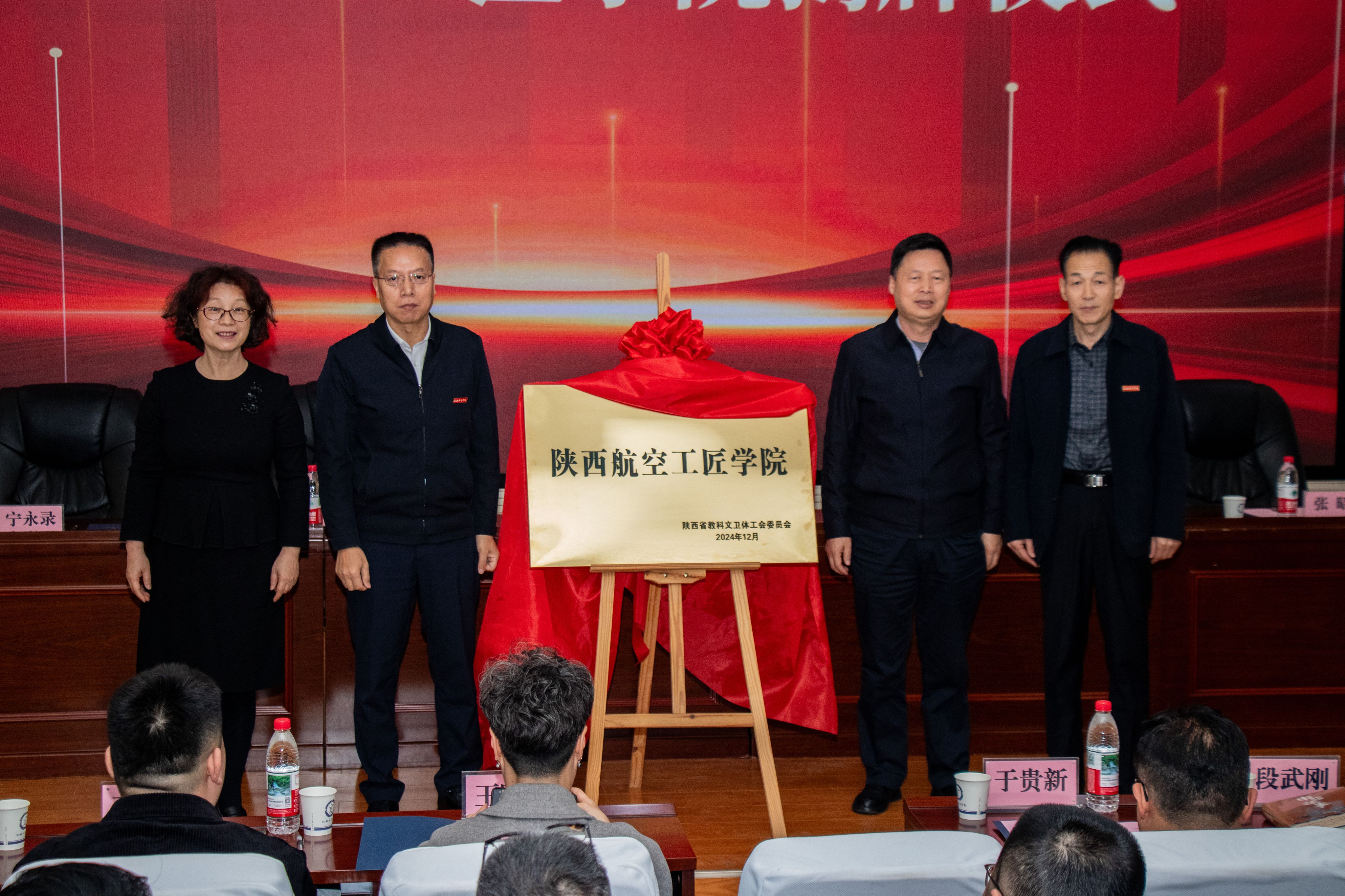 在热烈的掌声中,校长蒲永平、省教科文卫体工会主席徐富权、阎良航空基地管委会副主任仝秀丽、党委副书记张昭共同为“陕西航空工匠学院”揭牌,蒲永平给陕西航空工匠学院院长王永锋授牌。