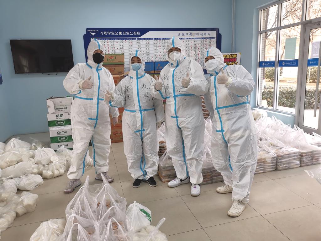 学生党员和积极分子主动申请参与志愿者服务工作,累计达123人。每天几千份盒饭、几百桶桶装水和成箱的生活物资仅靠志愿者们一层层爬楼送达。他们肩扛手抬,上下奔波,几个来回下来累的不能走动,大部分志愿者都是连续奋战,毫无怨言。除了生活物资的运送,每日的厕所消杀和垃圾运送任务艰巨,志愿者们克服困难,承担着被感染的风险,不怕脏和苦,默默地工作着。穿梭在楼间的“大白”给了同学们希望和温暖,鼓励着彼此不再害怕和担忧。