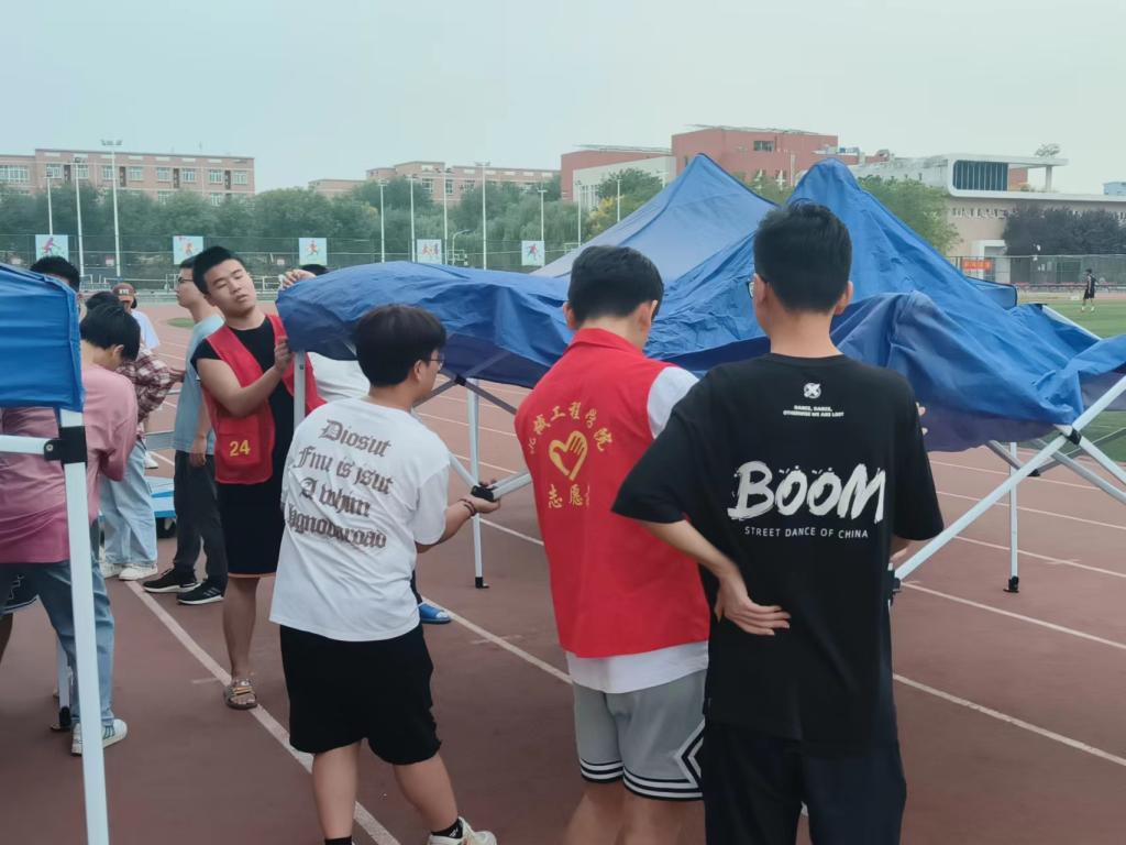 二十余名志愿者积极参与活动中,提前到达指定场所集合,熟悉工作流程、展开工作。志愿者们在岗位上尽职尽责,主要负责配合工作安排,搬放搭建帐篷。